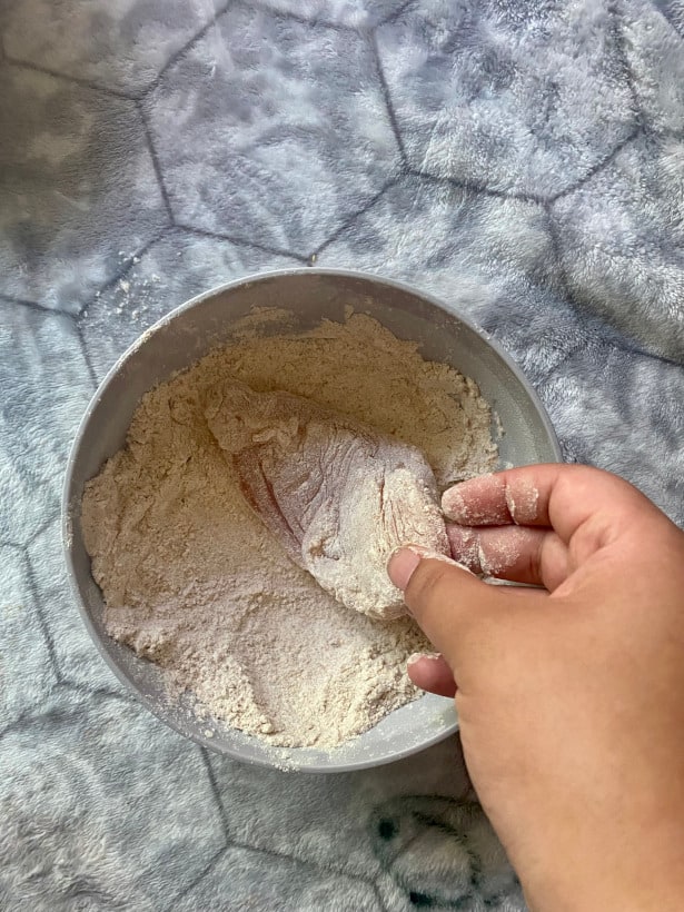 2. Cover the chicken breasts and tap the excess flour.