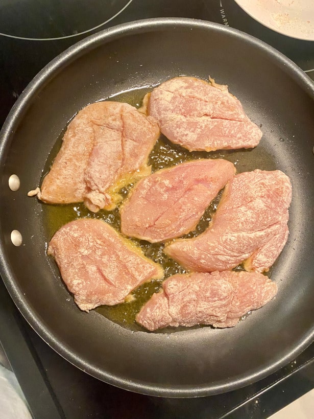 Heat the oil in a large nonstick skillet over medium-high heat.  Place the flour-dusted chicken in the pan, shaking off any excess first. Cook, turning once, until the chicken is golden and just barely cooked through, about 5 minutes total. Transfer the chicken to a plate and set aside.